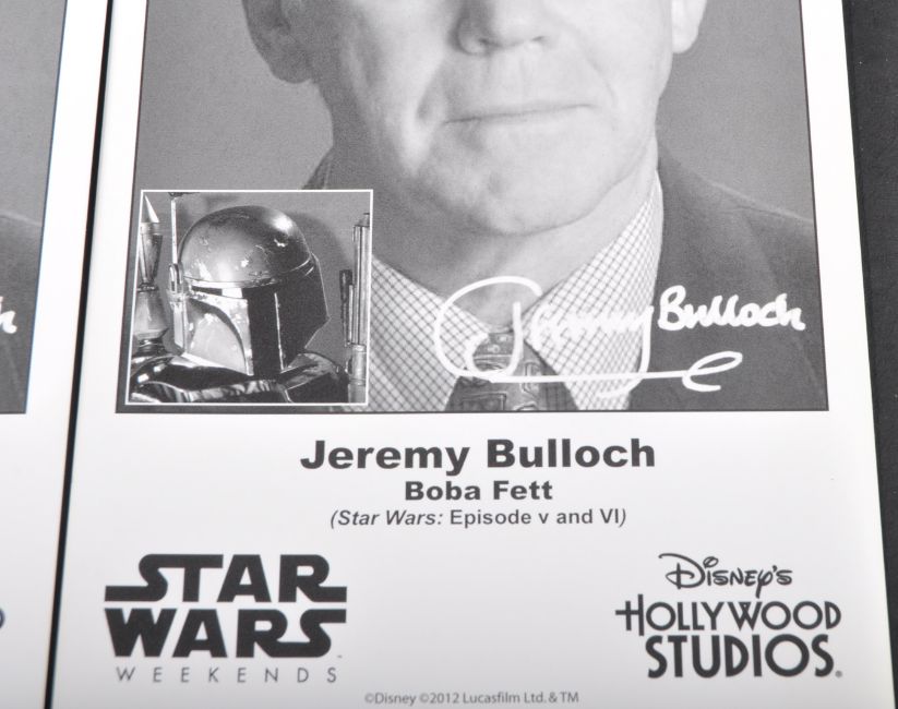 Estate of Jeremy Bulloch - Star Wars Weekends - two official Disney Hollywood Studios Star Wars Weekends 8x5" autograph cards for Bulloch. Featuring a black and white headshot image, with printed autographs. Exclusive to the event.