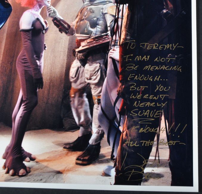 Estate of Jeremy Bulloch - Star Wars - Don Bies (Boba Fett in Special Edition) - a unique hand signed 8x10" colour photograph of Bies in the Special Edition release. Signed in gold ink ' To Jeremy - I may not be menacing enough.... but you weren't nearly suave enough!!! All the best, Don Bies'. A unique item between both Boba Fett actors. Obtained personally by Bulloch.