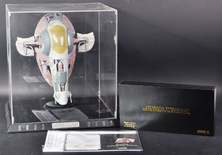 Estate of Jeremy Bulloch - Star Wars - Jeremy Bulloch's personally owned Code 3 Collectibles large scale high-end diecast model of Slave I, Boba Fett's ship. The highly detailed heavy diecast model being a 'President's Proof' edition (the first ones issued to important customers / VIPs before the official Limited Edition began). In excellent condition, the model complete with all small accessories housed within the original presentation case, Bulloch's Certificate of Authenticity complete with Collectors Patch, instructions, display stand, plinth base and acrylic case. Unboxed, and as displayed in Bulloch's home museum. The case and stand show very light signs of use from display, but otherwise the model and accessories are mint. A unique chance to purchase Boba Fett's personally owned Slave I model. Unique and important piece of Star Wars memorabilia.
