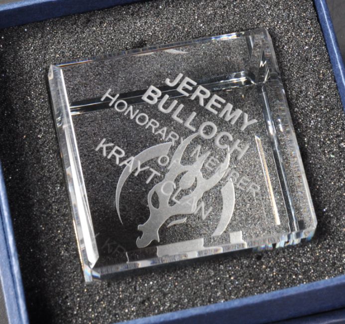 Estate of Jeremy Bulloch - Star Wars 501st Legion - Krayt Clan - an engraved glass cube presented to Bulloch by the Krayt Clan, a detachment of the 501st Legion. Engraved ' Jeremy Bulloch - Honorary Member of Krayt Clan '. Boxed. Cube measures 6cm square.