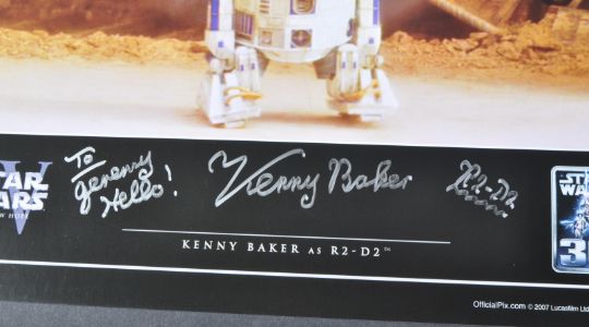 Estate of Jeremy Bulloch - Star Wars - Official Pix / Master Pix - Kenny Baker (1934-2016 R2D2)  - personally autographed official 8x10" high quality colour photograph. Signed in silver ink to the signature strip and dedicated ' To Jeremy - Hello!'. With character name added. Obtained personally by Mr Bulloch during the Star Wars 30th Anniversary celebrations. Unique piece of Star Wars memorabilia.