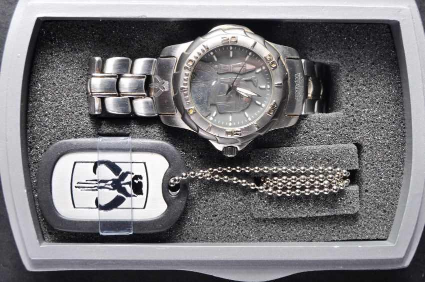 Estate of Jeremy Bulloch - Star Wars - Fossil - Bulloch's personally owned limited edition 2002 Fossil made Star Wars Boba Fett themed gentleman's wristwatch. The dial featuring Boba Fett. No. 0509 of 2000 made. Complete with all paperwork and Mandalorian medallion. Watch with signs of use from being worn. The image of Fett revolves in the dial and requires fixing in place. Not working, likely needs a replacement battery. Sold 'as is'. A special item from Bulloch's estate.