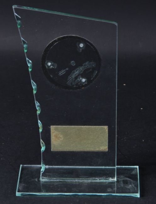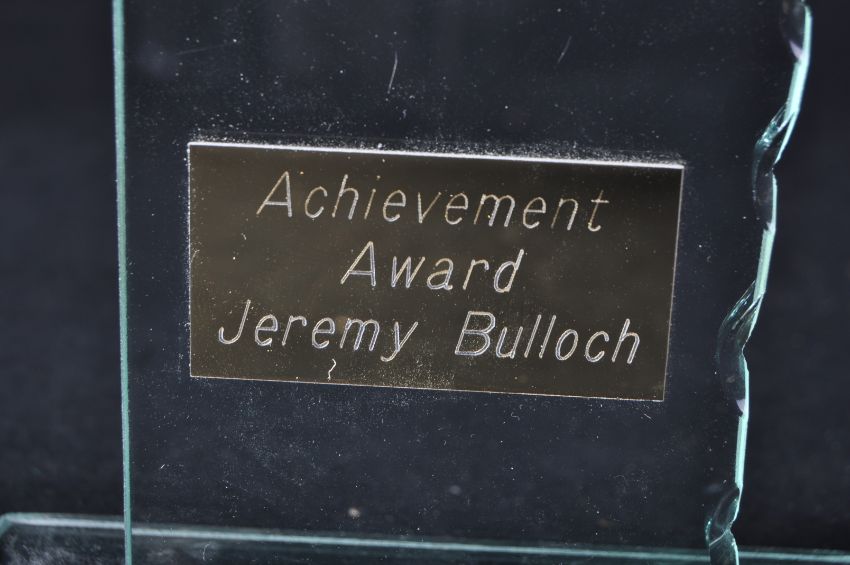 Estate of Jeremy Bulloch - Star Wars / Personal Appearances - a glass presentation award given to Bulloch in the 2000s. Small engraved brass plaque reads ' Achievement Award - Jeremy Bulloch ' and features a brass theatrical themed emblem to top. Measures 17cm tall.