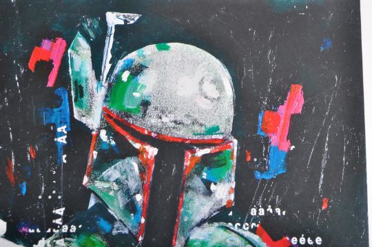 Estate of Jeremy Bulloch - Star Wars - Artwork - a large artwork print depicting Boba Fett with rifle raised, and an inset likeness of Jeremy Bulloch. Signed to the border by Bulloch (1945-2020) in black ink, with character name added. Framed. Total size 53cm x 43cm.