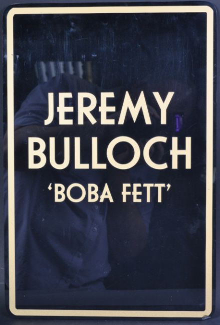 Estate of Jeremy Bulloch - Star Wars Disney Weekends - Mr Bulloch's original heavy duty acrylic plaque from his appearance at Disney MGM Studios Weekends event. The plaque with gold coloured applied lettering ' Jeremy Bulloch - Boba Fett '. Light wear from use. Measures approx; 46cm x 31cm.