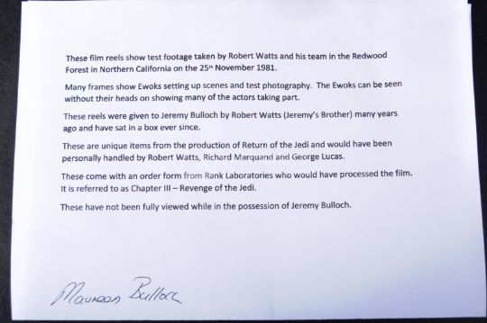 Estate of Jeremy Bulloch - Star Wars Return Of The Jedi (1983) - two reels of believed unseen behind the scenes test footage from the movie. The footage was shot in Redwood Forest, Northern California on 25th November 1981 and shows Ewoks setting up for scenes and test photography. The reels are accompanied by a note from Maureen Bulloch (Jeremy's Wife) which reads: