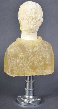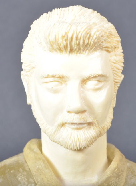 Estate of Jeremy Bulloch - Star Wars Fan Art - George Lucas - a fan made resin bust of Star Wars creator George Lucas. Signed to the underside by artist Toshiharu and dated 2008. Sculpted resin face, with a translucent resin body, mounted on a chrome effect rounded base. Measures 20cm tall.