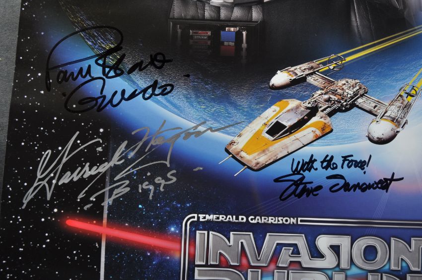 Estate of Jeremy Bulloch - Star Wars - Invasion Dublin - autographed event poster from the Irish convention, signed by several Star Wars cast members, including: Kenny Baker (1934-2016), Paul Blake (Greedo), Garrick Hagon (Biggs), Steve Sansweet (Rancho Obi-Wan), Julian Glover (General Veers), and Michael Kingma (Tarrful). All signed with character names added. Measures; 60cm x 42cm.