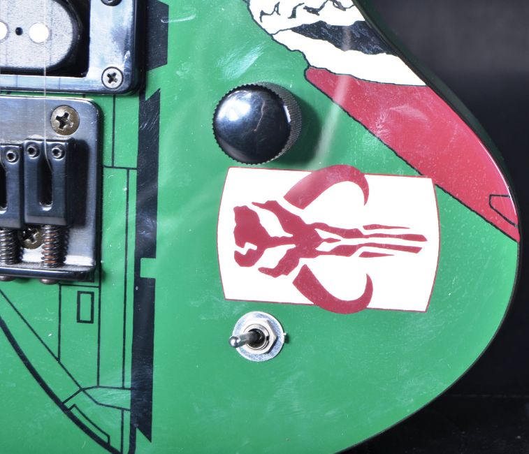 Estate of Jeremy Bulloch - Star Wars - Bulloch's personally owned 2001 Fernandes made Limited Edition Boba Fett Star Wars themed electric guitar. Six string, with in-built amplifier, humbucker pickup, single volume knob and on/off switch. The shaped body featuring a likeness of Boba Fett. With original Star Wars strap, special Boba Fett themed guitar pick, paperwork and official soft carry case. This guitar used to hang around the neck of Bulloch's life-size Boba statue in his home museum (see photos). Light signs of use, but no damage and in full working order.