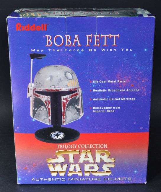 Estate of Jeremy Bulloch - Star Wars - Boba Fett - Bulloch's personally owned Riddell Inc made Trilogy Collection ' Boba Fett Authentic Miniature Helmet '. 1/2 scale (or similar size). Sealed within its polystyrene and housed within its original box.