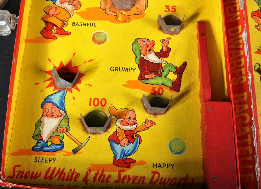 A vintage circa 1930's Chad Valley made Disney Snow White & The Seven Dwarfs table top bagatelle board game and a Marx Toys ' Channel Chase ' pinball game. The bagatelle game of cardboard construction with spring pull lever to release balls that land on the various metal cups to score points. Colour illustrations of Snow White characters throughout.