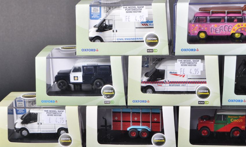 A collection of x15 assorted Oxford Diecast ' Commercials '1/76 scale / trackside model cars to include; BOAC Bedford CA Minibus, Stobart Rail Ford Transit LWB, Hong Kong Police Land Rover, British Railways Land Rover 109" Canvas and others. Models appearing mint within original boxes.