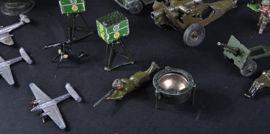 A collection of assorted vintage Military interest diecast model vehicles by makers Dinky Toys, Britain's and Lone Star along with a quantity of lead toy soldiers. Examples to include Dinky Toys 3 Ton Army Wagon, Viking Aircraft, Lone Star Armoured Car, Britain's Artillery / Field Guns and more.