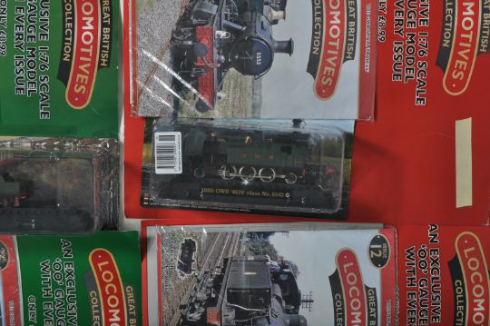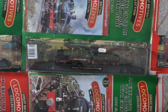 A large collection of assorted ' Great British Locomotives Collection ' 00 gauge model railway trainset models with accompanying subscription magazines. Examples to include; No. 46203 Princess Margaret Rose, 6023 King Edward II, 21C151 Winston Churchill, 5542 GWR Class 4575 and others. Models appearing mint on display plinths with sealed magazines.