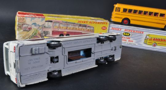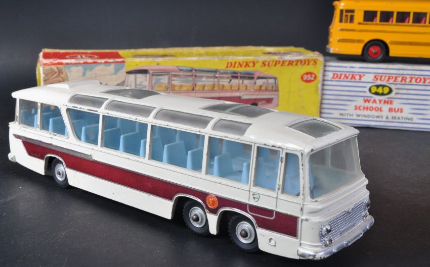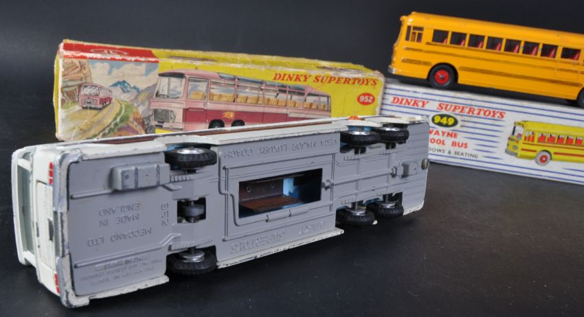 Two vintage Dinky Supertoys boxed diecast model buses comprising No. 952 Vega Major Luxury Coach and 949 Wayne School Bus with windows and seating. Models appearing G+ within original boxes.