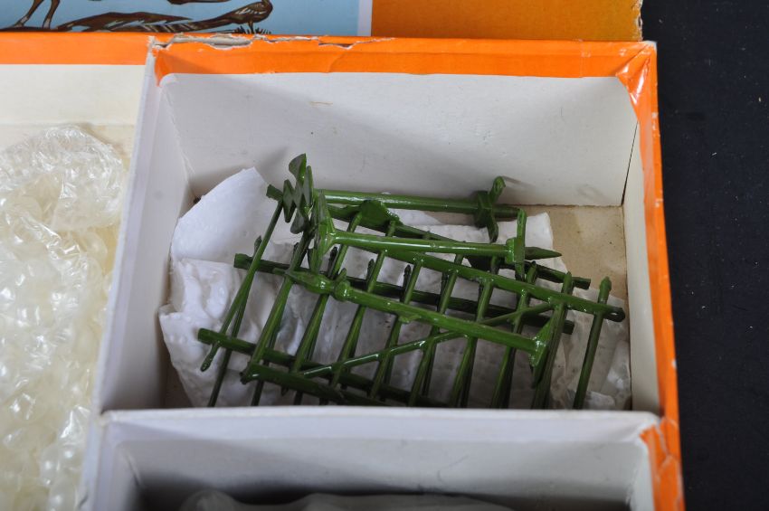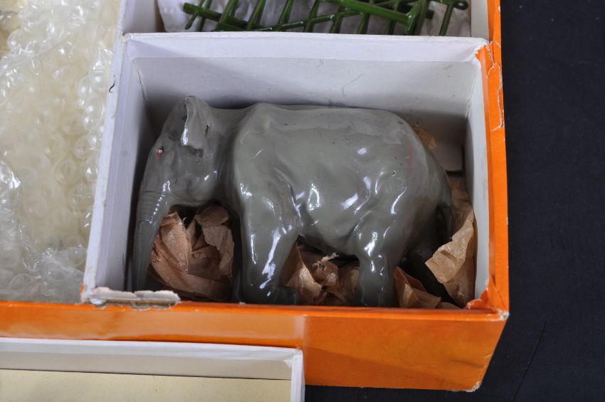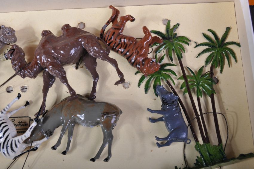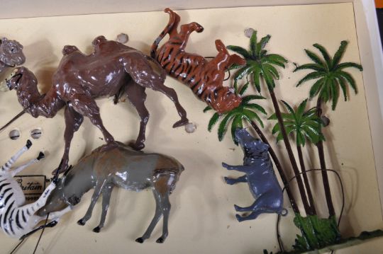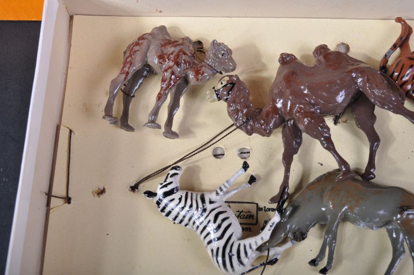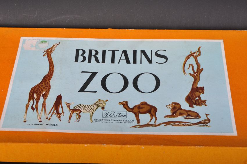 An original vintage Britain's made Zoo Animal Series set No. 24Z. The double layer box set being a post-war examples containing the following lead figures; Elephant with fence and fence posts, Palm Tree, x2 Camels, Tiger, Zebra, Antelope, Warthog, Lama, x3 Pandas, Tortoise and x4 people. Housed in a good original box.