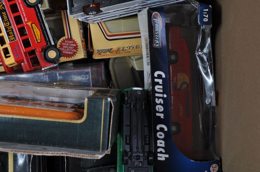 A large collection of assorted diecast model cars and buses of various scales and makers. Examples to include Minichamps, Corgi James Bond, EFE Exclusive First Editions, Corgi Original Omnibus, Solido, Lledo Days Gone and others. Largely boxed examples.