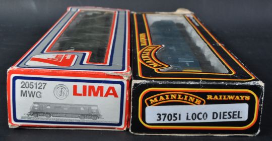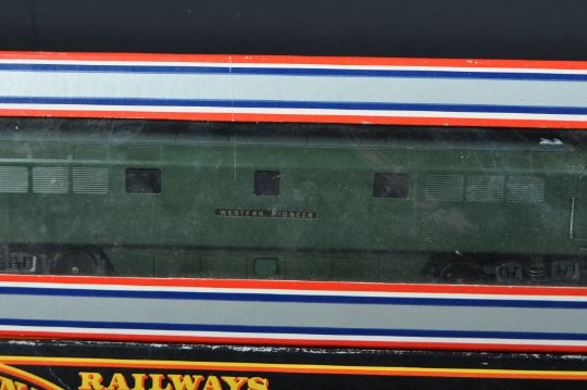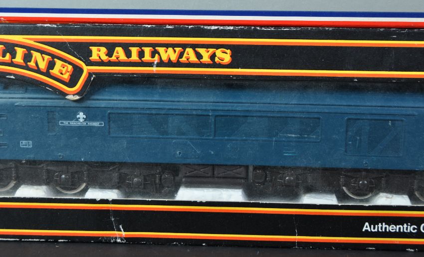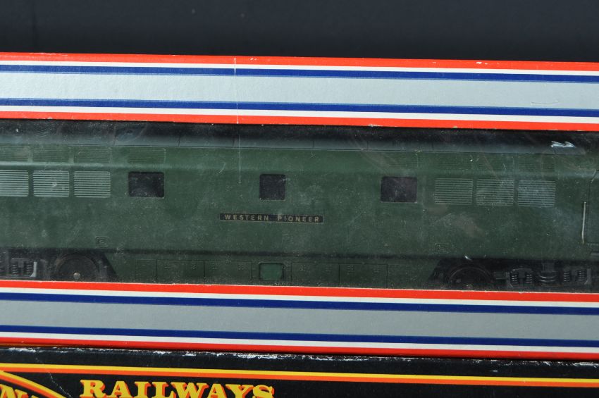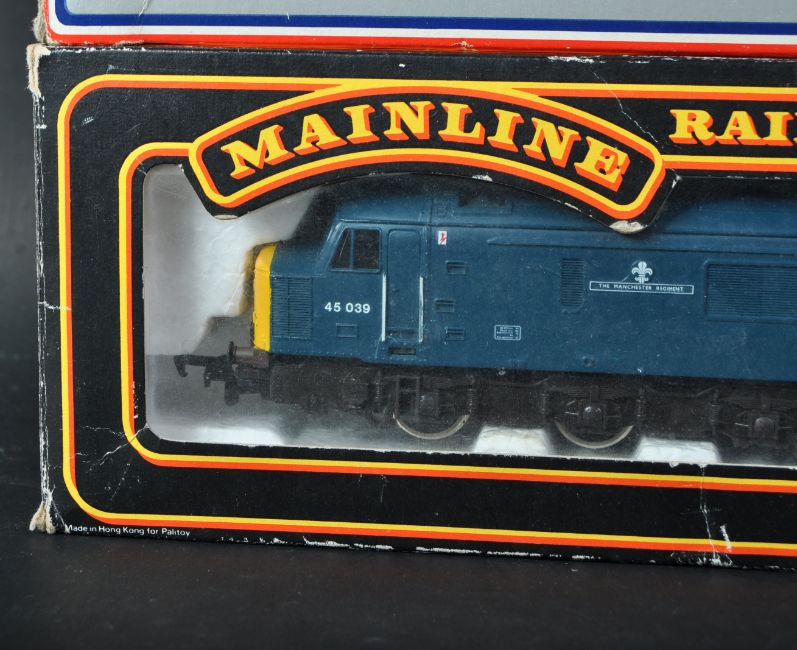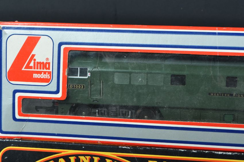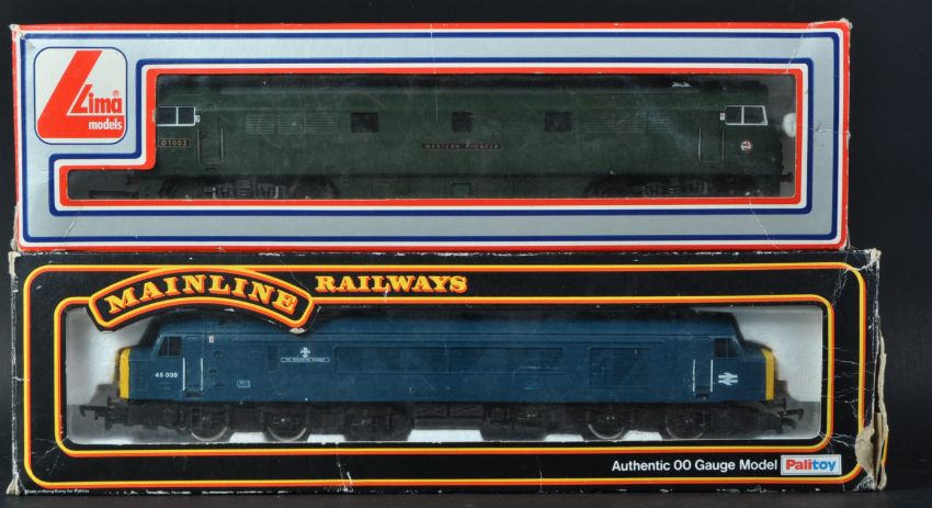 Two vintage Lima and Palitoy Mainline 00 gauge model railway diesel trainset locomotive engines comprising; Lima 205134 Class 52 D1003 'Western Pioneer' in BR green and Mainline 37-051 Main Class 45 45039 'The Manchester Regiment' in BR Blue.