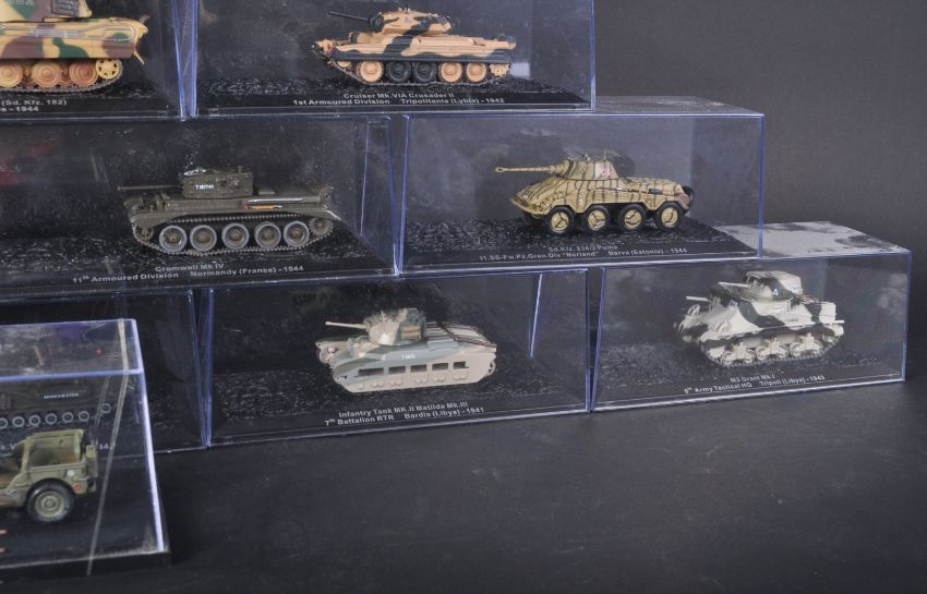 A collection of x21 assorted Atlas Editions and Hobby Masters diecast model Military tanks. Examples to include; Churchill MK VII 6th Guards Tank Brigade Normandie 1944, M3 Grant Mk I 8th Army Tactical HQ Libya 1943, Challenger UK Mainland Division 1984 and others. Models appearing mint with original perspex boxes.