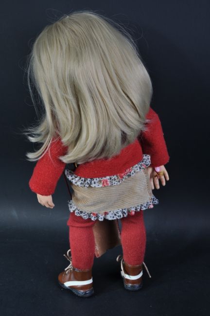 An original circa 2003 Gotz made for Steiff vinyl doll ' Giselle '. The doll with blonde hair, blue glass eyes, eyelashes, finely painted brows and gold plated Steiff button to the left ear. Dressed in the original outfit with chiffon scarf and satchel accessories. Measures approx 48cm.