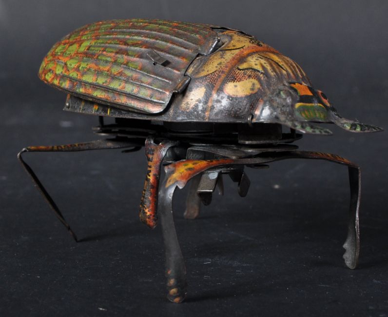 A vintage believed German made tinplate mechanical / clockwork crawling Beetle. Litho printed tinplate body and wings that flap when the key to the base is wound. Measures approx 10cm long.