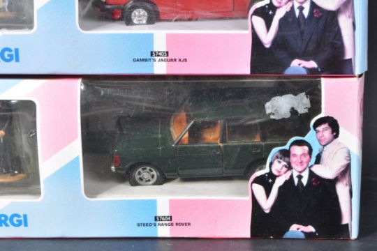 Two original Corgi ' The New Avengers ' diecast model car sets comprising 57405 Gambit's Jaguar XJS and 57604 Steed's Range Rover. Models appearing unused with white metal hand painted figures and original boxes.
