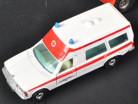 A collection of x8 original vintage Corgi Toys / Corgi Major Toys diecast model Fire Engines. Examples to include; Chubb Pathfinder Airport Crash Truck, American France Ariel Rescue Tractor with Articulated Trailer, Ford Transit and others. Various conditions.