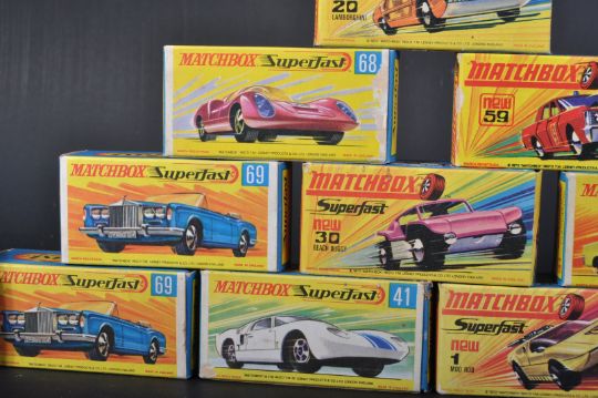 A collection of x12 original vintage Lesney made Matchbox Superfast boxed diecast model cars to include; No. 68 Porsche 910, 67 Volkswagen 1600TL, 69 Rolls Royce Silver Shadow, 31 Lincoln Continental and others. Models generally appearing mint, within good original boxes.