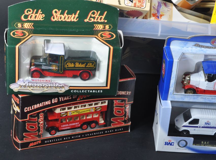 A large collection of assorted diecast model cars. Largely Lledo Days Gone advertising models of public transport and haulage examples along with some Corgi Eddie Stobart. Contents appearing mint, within original boxes.
