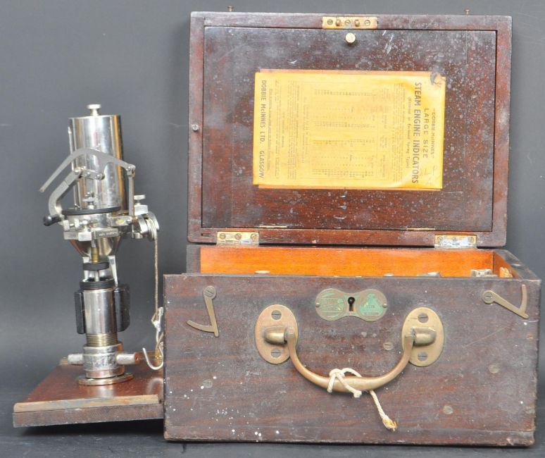 A vintage 20th century Dobbie-McInnes of Glasgow engine indicator within a mahogany case bearing makers plaque with label to interior and a Dobbie-McInnes card.