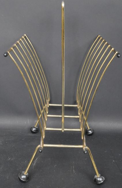 A vintage retro mid 20th century atomic sputnik style metal wire record vinyl rack having carry handle and black ball feet. Measures 42cm tall.