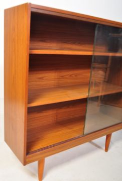 Schreiber - A retro vintage mid 20th century circa. 1960's Schreiber Danish inspired teak veneer display cabinet. The bookcase having a series of two shelves with twin sliding glazed doors upon a block base. Measures approx. 101cm x 92cm x 29cm.