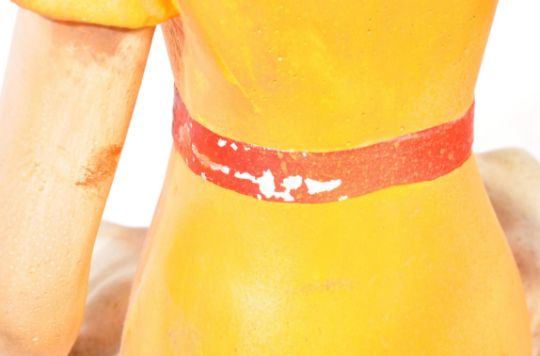 A 1930s Art Deco plaster figure of a lady stood between two dogs raised on a naturalistic base having vivid polychrome detailing. Measures