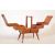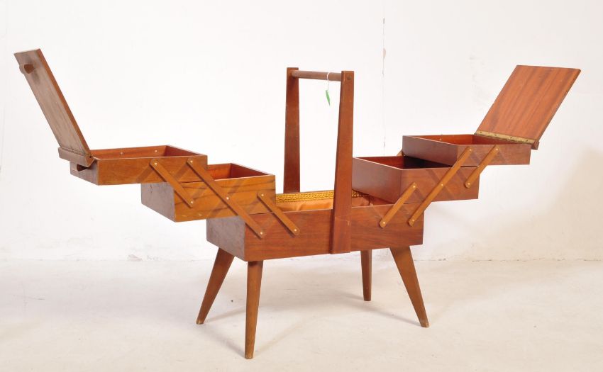 A retro vintage mid 20th century teak metamorphic sewing box raised over tapering supports. Together with a miniature wicker chair and a galvanised metal bucket. Measures 60cm tall.
