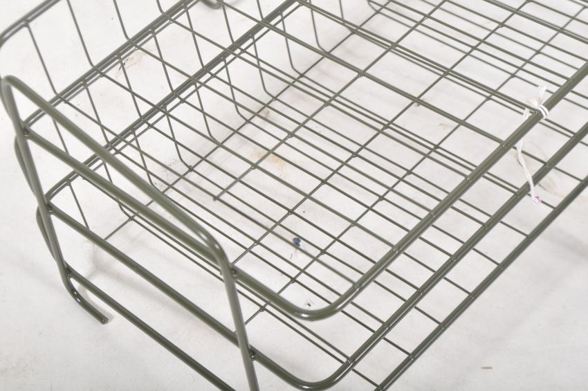 Hago - Model 101 - A collection of four retro vintage industrial atomic space age sputnik three tier letter racks of tubular form with finials. Each in original box in as new condition. Boxes indicate colour via label. Buyers are advised to satisfy themselves regarding condition before purchasing. Approx 40cm wide.