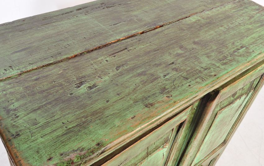 A vintage 20th century painted drinks cabinet having a flared top over fielded panelled doors raised on a plinth base. The cabinet is painted in a distressed dark green colourway. Measures 108cm H x 83cm W x 41cm D
