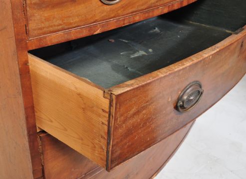 A 19th Century George III mahogany bow front chest of drawers. The chest having a bank of 4 drawers with oval brass backplate pulls. Measures approx 88cm x 100cm x 54cm.