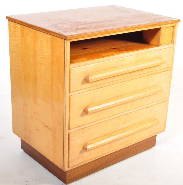 Vintage mid 20th century blond wood School / Plan chest of drawers. Raised on inset plinth base with an upright bank of drawers and open shelf atop. The drawers with long pull handles. Measures 92cm x 89cm x 63cm.