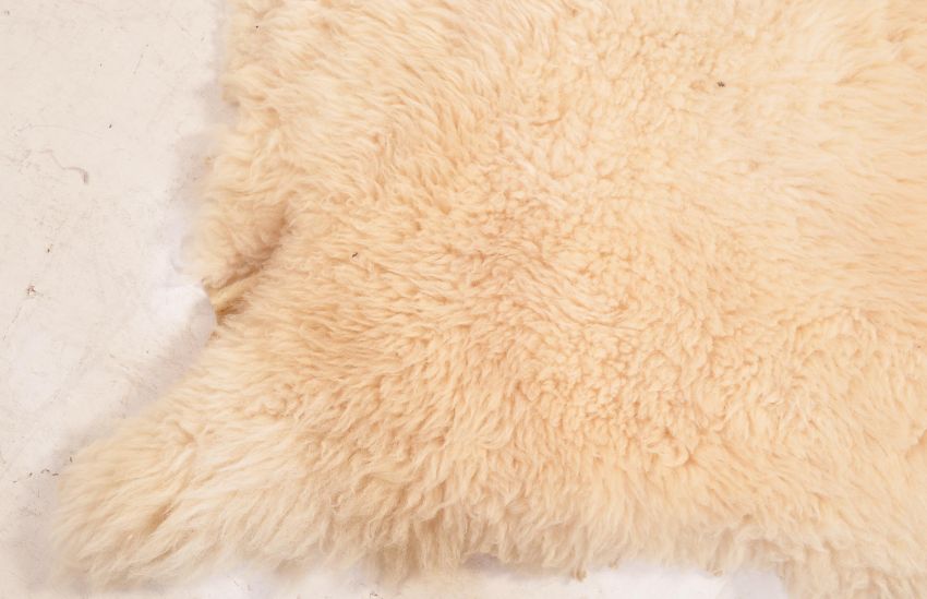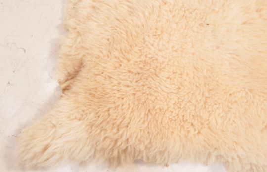 A retro vintage mid 20th century deep pile sheepskin rug of asymmetrical form. Makers badge to the underside. Measures approx. 51cm x 84cm 53cm