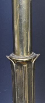 A vintage 20th century brass lamp base / electrolier in the form of a Corinthian column having curling acanthus leaves to the top over lotus leaves raised on a square base. Measures 42cm high.