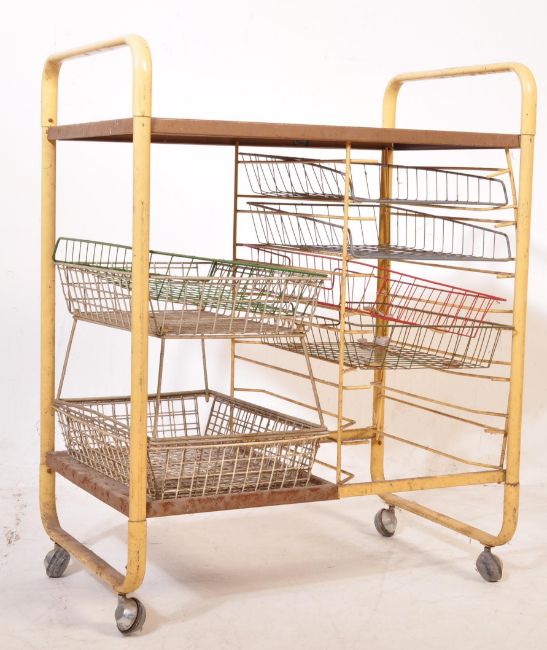 A retro vintage mid 20th century circa 1960's utility trolley having a yellow tubular metal frame with metal trays beneath. Measures approx. 83cm x 65cm x 42cm
