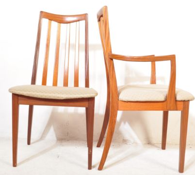 G-Plan - A retro vintage mid 20th century G Plan teak wood extendable dining table. The table having oval top with tapering teak supports. Together with four dining chairs and two carver chairs. Measures 74cm x 162cm x 111cm.