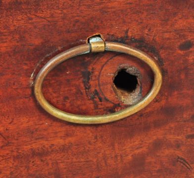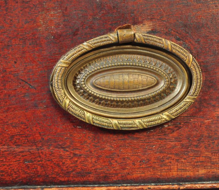 A 19th Century George III mahogany chest of drawers. The chest of rectangular form is a bank of 4 drawers, with oval brass back plate pulls all raised on bracket feet. Measures approx 90cm H x 85cm W x 48cm D