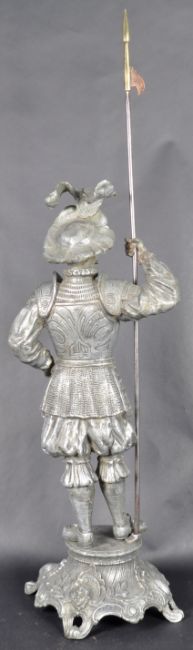A 19th Century spelter bronze figurine of a 16th / 17th Century Italian knight. The figure modelled standing holding polearm with feathered hat wearing twin griffin breastplate. Raised on relief cast pedestal base. Measures approx; 90cm.