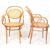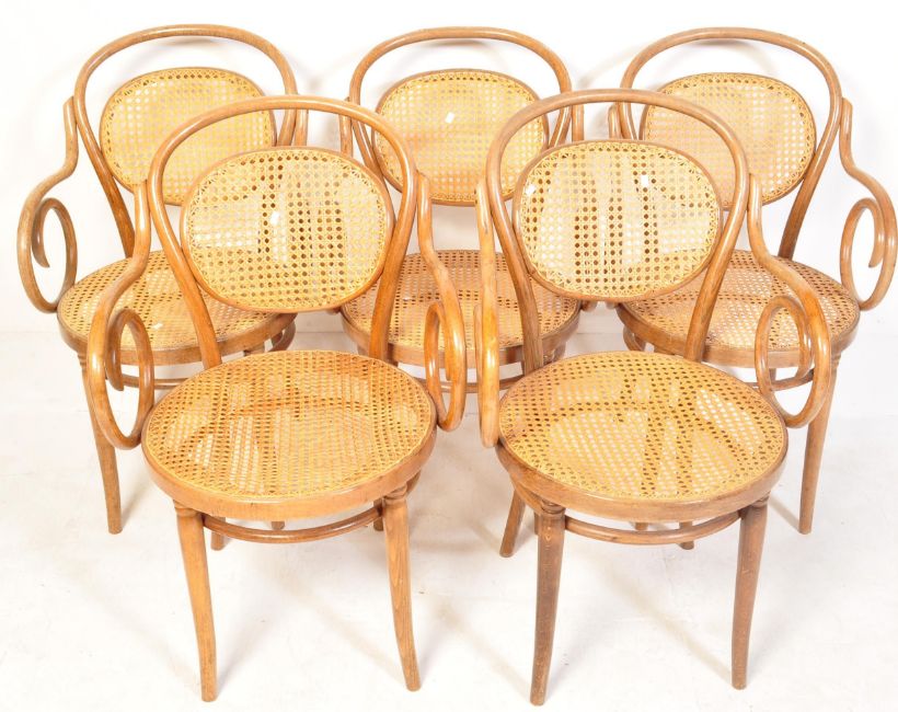 A collection of six vintage 20th century Thonet style dining chairs having a curved backrest, rattan back and seat flanked by scrolled elbow rests. Dinette stamp to the underside. Measures approx 90cm x 54cm x 63cm.