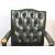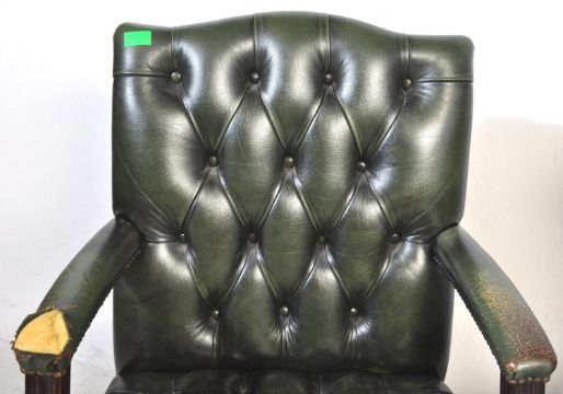 A vintage 20th century green leather and wood frame Gainsborough chair having shaped elbow rests raised over square supports united by stretchers.