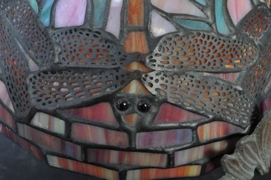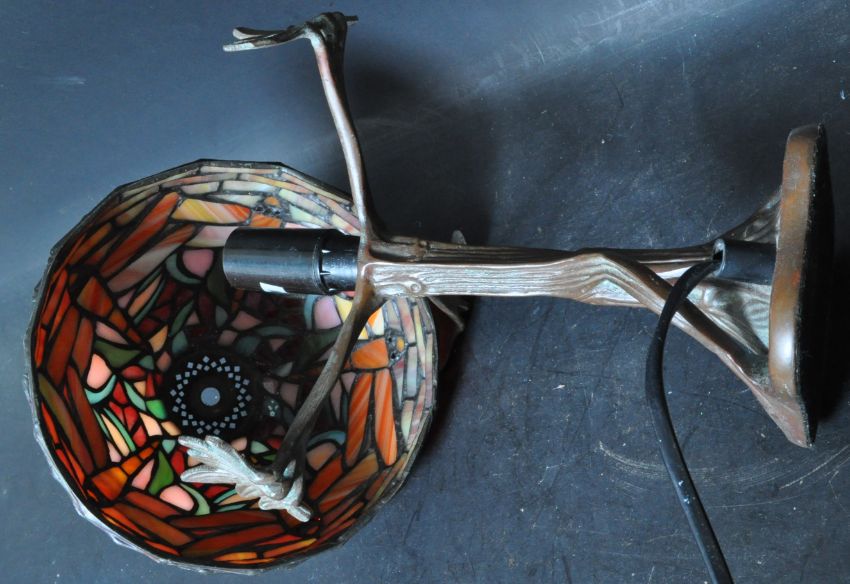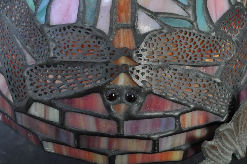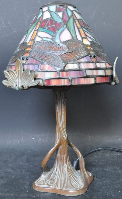 A 20th Century vintage retro Art Nouveau Tiffany style desk lamp / table lamp. The lamp having a multicolour panel glass shade with dragonflies embellishments raised on metal naturalistic looking base.