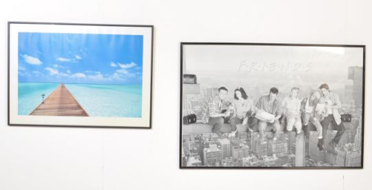 A retro vintage 20th Century F.R.I.E.N.D.S print framed and glazed. Depicting the gang sat high above New York City on a scaffolding beam, laughing and joking with each other. Together with a frame print of Yukimasa Hirota - Maldives. Measures approx. 63cm x 94cm.