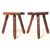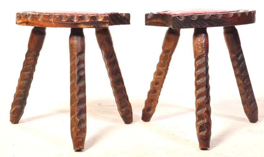A pair of vintage 20th century Spanish hardwood carved milking stools. Each stool having a horse shoe shaped seat with leather upholstered seat pad raised upon tripod legs. Measures 40cm tall.