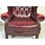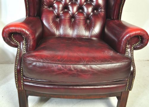 An early 20th century red leather chesterfield wingback armchair having studded shaped back rest and scrolled elbow rests.